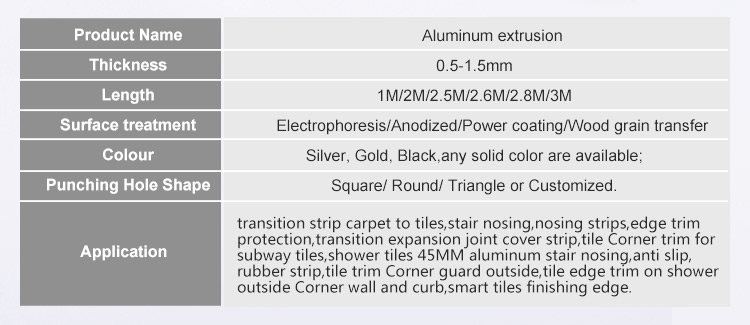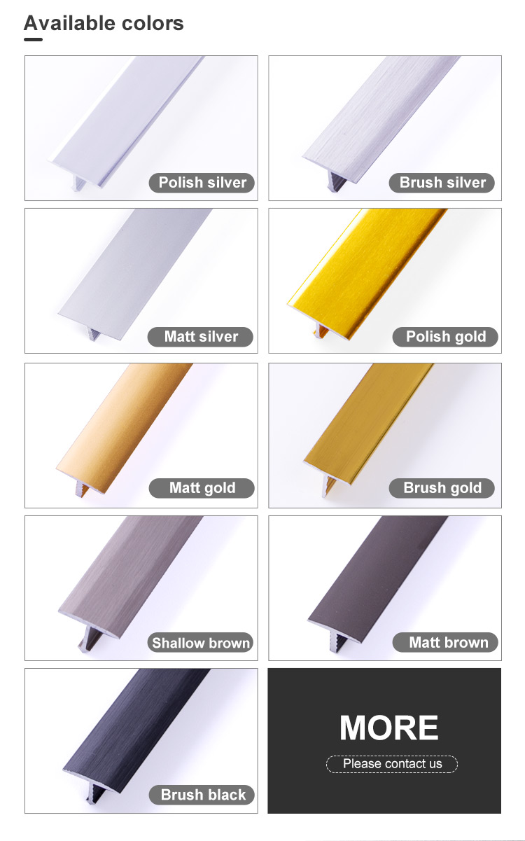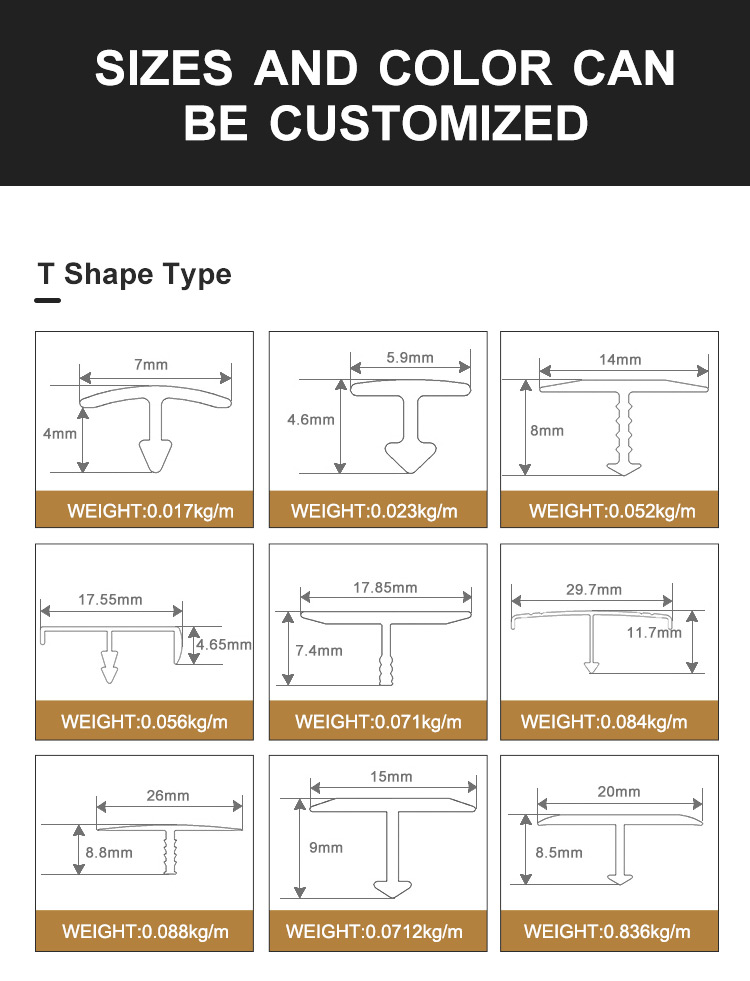 形状:T型 宽度: 6mm/8mm/10mm/12mm/可定制高度 长度:2.5m/2.7m/可定制长度 打洞:方形/圆形/三角形/星形/钻石形/字母/可定制图案 表面处理:抛光、阳极氧化处理、粉末涂层等